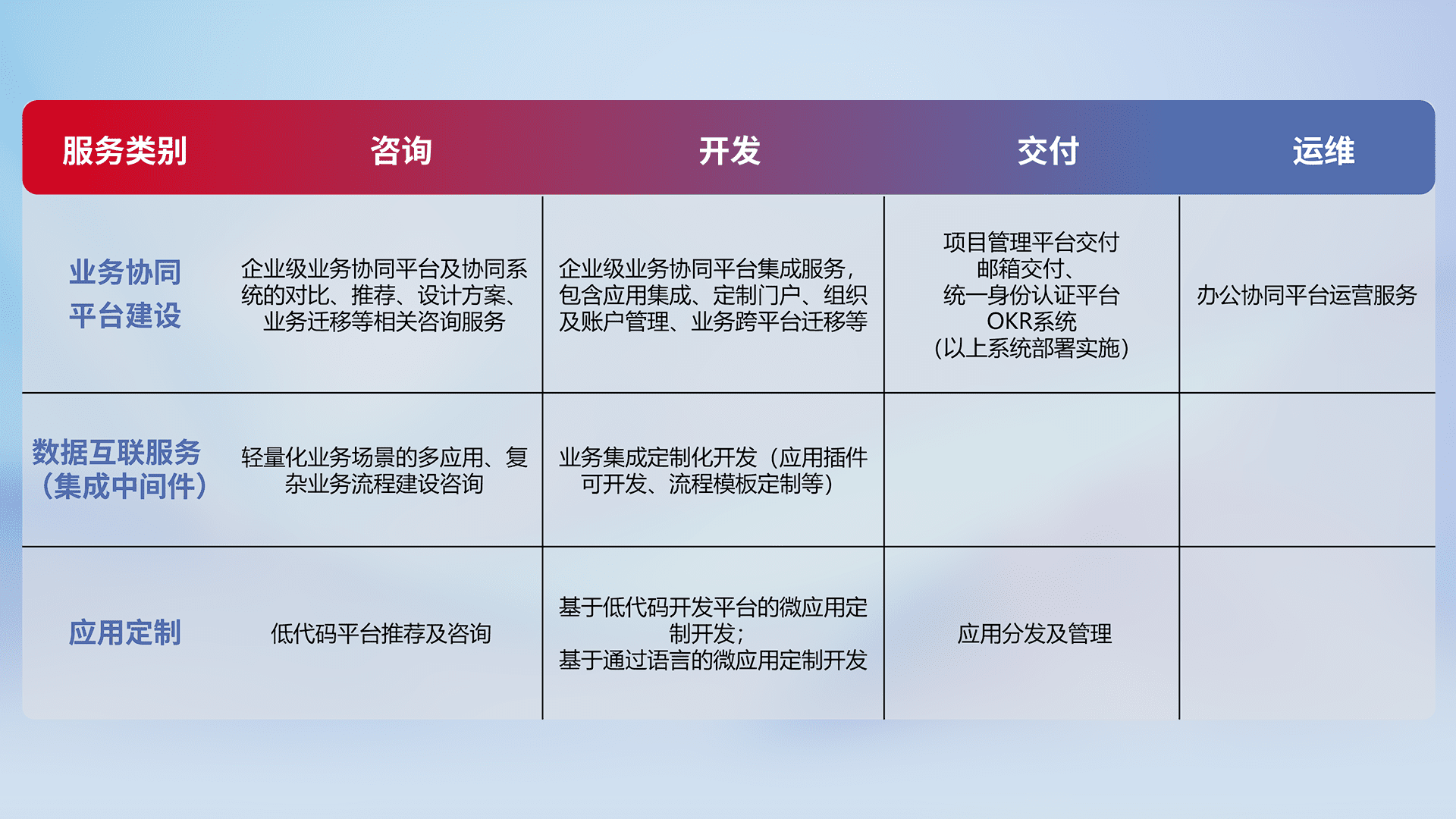 针对钉钉、、企微、、、、IDaas等平台级产品提供产品的规划、、、、方案、、、交付、、、、定制化开发等服务,,,实现如统一协同办公、、、智能客户服务、、、、混合会议管理、、智能数据查询、、等业务场景,,实现数字化转型。。